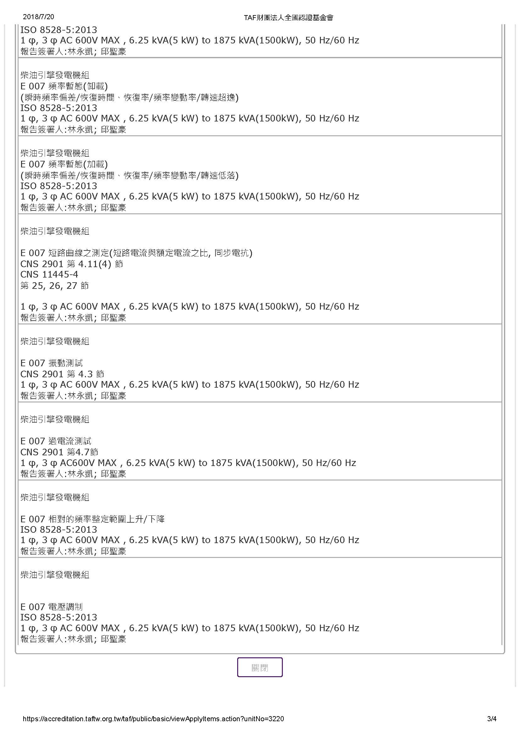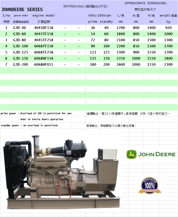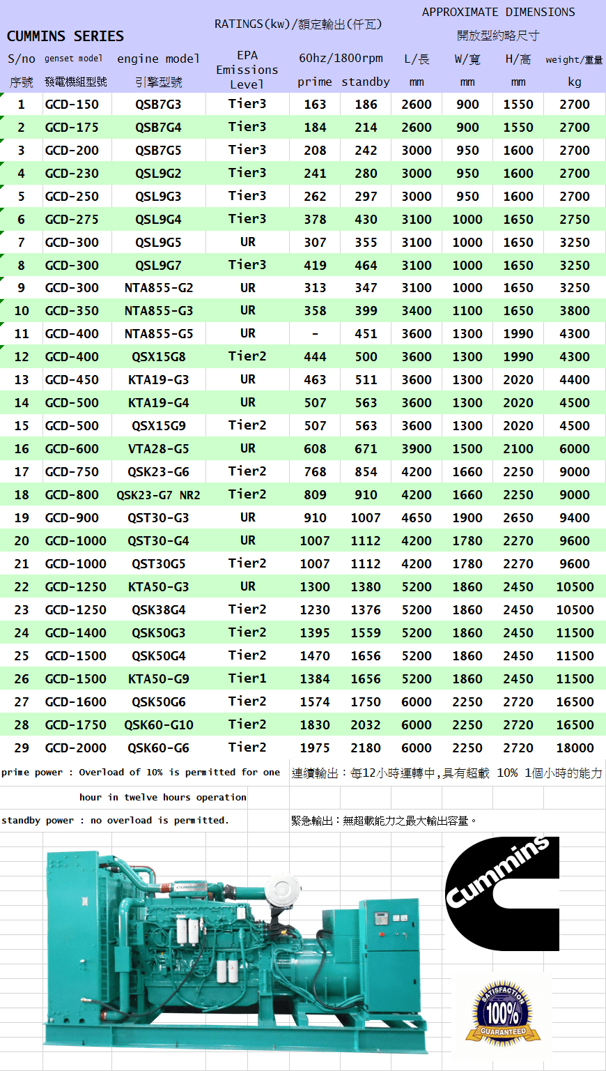 採用歐美日進口知名廠牌之工業用引擎,柴油,四行程,馬力強勁、堅固 耐用。機組為一體式結構,基座選用高強度鋼材料製作,柴油引擎及交流 發電機與基座加設防震設備,水箱葉片冷卻風扇並設有保護網罩,以防硬 物捲入造成損壞。引擎保護系統完善,可完全確保使用時人員及機組之安全。